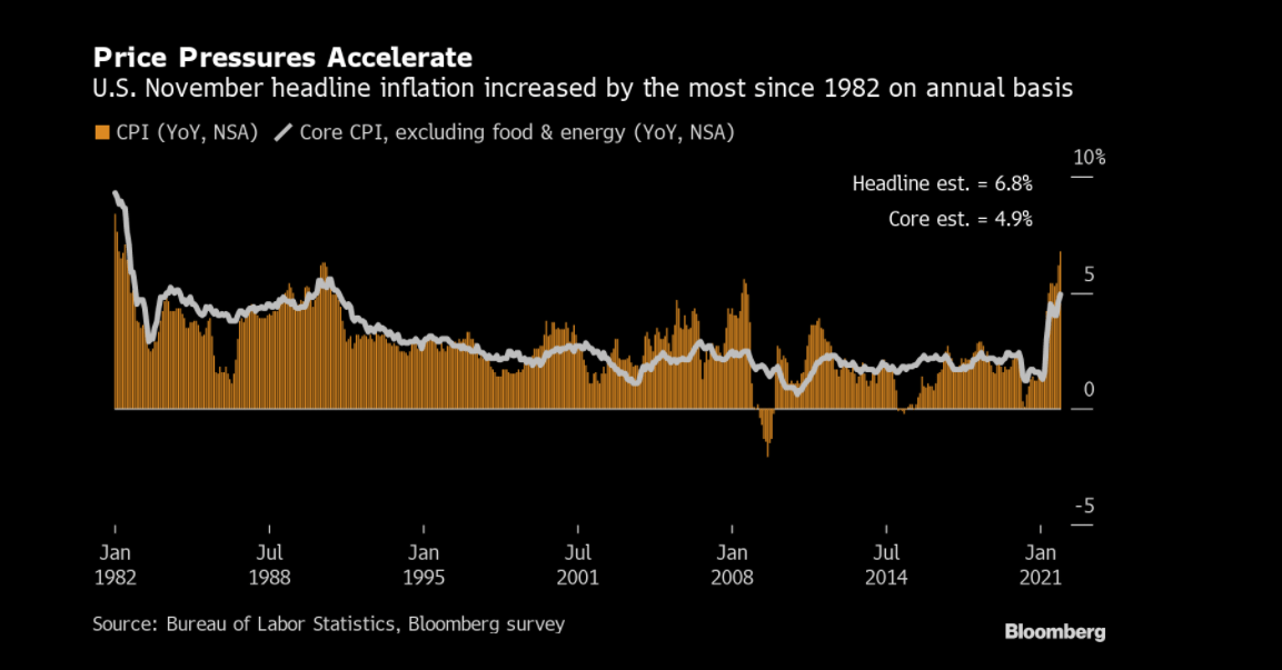 داده های شاخص قیمت مصرف کننده (CPI) که روز جمعه توسط اداره آمار کار ایالات متحده منتشر شد، نشان می دهد که قیمت ها در ایالات متحده در ماه نوامبر نسبت به 12 ماه قبل 6.8 درصد افزایش یافته است. این بزرگترین افزایش در نزدیک به چهل سال گذشته است و سیاستگذاران ایالات متحده به سرعت از گفتن اینکه تورم گذرا است عقب نشینی می کنند.