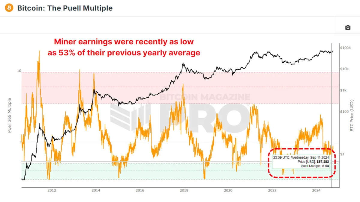 یکی از بهترین راهها برای ارزیابی احساسات ماینرهای بیتکوین، بررسی درآمدهای آنها در رابطه با دادههای تاریخی است. این کار را می توان با استفاده از The Puell Multiple انجام داد، که درآمد فعلی ماینرها را در برابر میانگین سالانه سال قبل اندازه گیری می کند.
