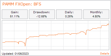 این ارائه دهنده از تاریخ 05/12/2022 با FXOpen معامله می کند و از زمان افتتاح حساب نتایج خوبی از خود نشان داده است. در سال 2022، آنها توانستند 45.55 درصد از سود را به دست آورند. از میان تمامی معاملات، 81 درصد سودآوری دارند و دارای اهرمی بین 1 تا 100 هستند. حداکثر سطح نزول در محدوده 12.68 درصد باقی می ماند. این ارائه دهنده تنها یک جفت تجاری – AUD/CAD را معامله می کند. در ماه دسامبر، +6.93٪ سود، با حداکثر بار سپرده 2.40٪ و حداکثر برداشت 0.74٪ به دست آمد. می توان با مبلغ 50 دلار به این مدیر ملحق شد، جریمه برداشت زودهنگام 5 درصد است.