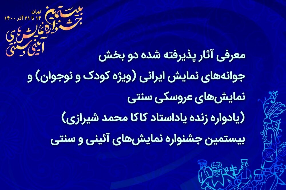 به گزارش خبرگزاری خبرآنلاین، هیأت انتخاب دو بخش جوانه‌های نمایش ایرانی (ویژه کودک و نوجوان) و نمایش‌های عروسکی سنتی (یادواره زنده‌یاد استاد کاکامحمد شیرازی) بیستمین جشنواره نمایش‌های آئینی و سنتی متشکل از هنگامه مفید، داریوش نصیری و مهدی صفاری‌نژاد پس از ارزیابی تعداد ۷۸ اثر رسیده به دبیرخانه در بخش جوانه‌های نمایش ایرانی، ۲۱ اثر و از ۲۲ اثر رسیده به بخش نمایش‌های عروسکی سنتی، ۷ نمایش را به منظور حضور در این دوره از جشنواره معرفی کردند.