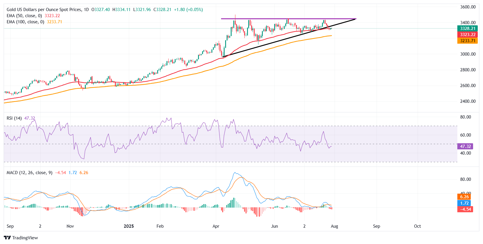 از دیدگاه فنی ، XAU/USD در حال آزمایش یک منطقه تلاقی کلیدی در نمودار روزانه است ، جایی که میانگین متحرک 50 روزه (EMA) با 3،323.22 دلار با یک پشتیبانی از روند رو به رشد که از مارس کمترین استفاده می شود ، همپوشانی دارد. در حالی که قیمت در حال حاضر به طور حاشیه ای زیر خط روند صعودی معامله می شود ، این نقض فاقد حرکت شدید است ، نشان می دهد که ممکن است یک شکست کاذب باشد.