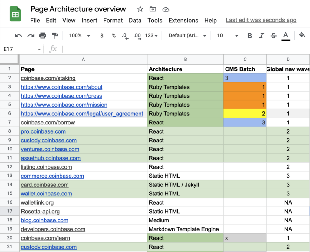در حین بررسی وضعیت صفحات فرود محصول Coinbase، ما 40 سطح محصول را در 15 مخزن مختلف / برنامه های کاربردی ظاهر کردیم. پیشانیهای مختلف با استفاده از فناوریهای مختلفی ساخته شدهاند – از React with Typescript (استاندارد فعلی ما) گرفته تا الگوهای قدیمی Ruby on Rails و HTML ایستا.