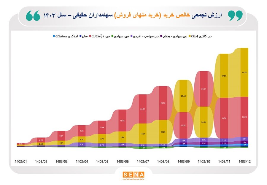 ارزش تجمعی خالص خرید حقیقی در این دو مقصد سرمایه‌گذاری به ترتیب ۳.۱ و ۲.۶ همت بوده است.