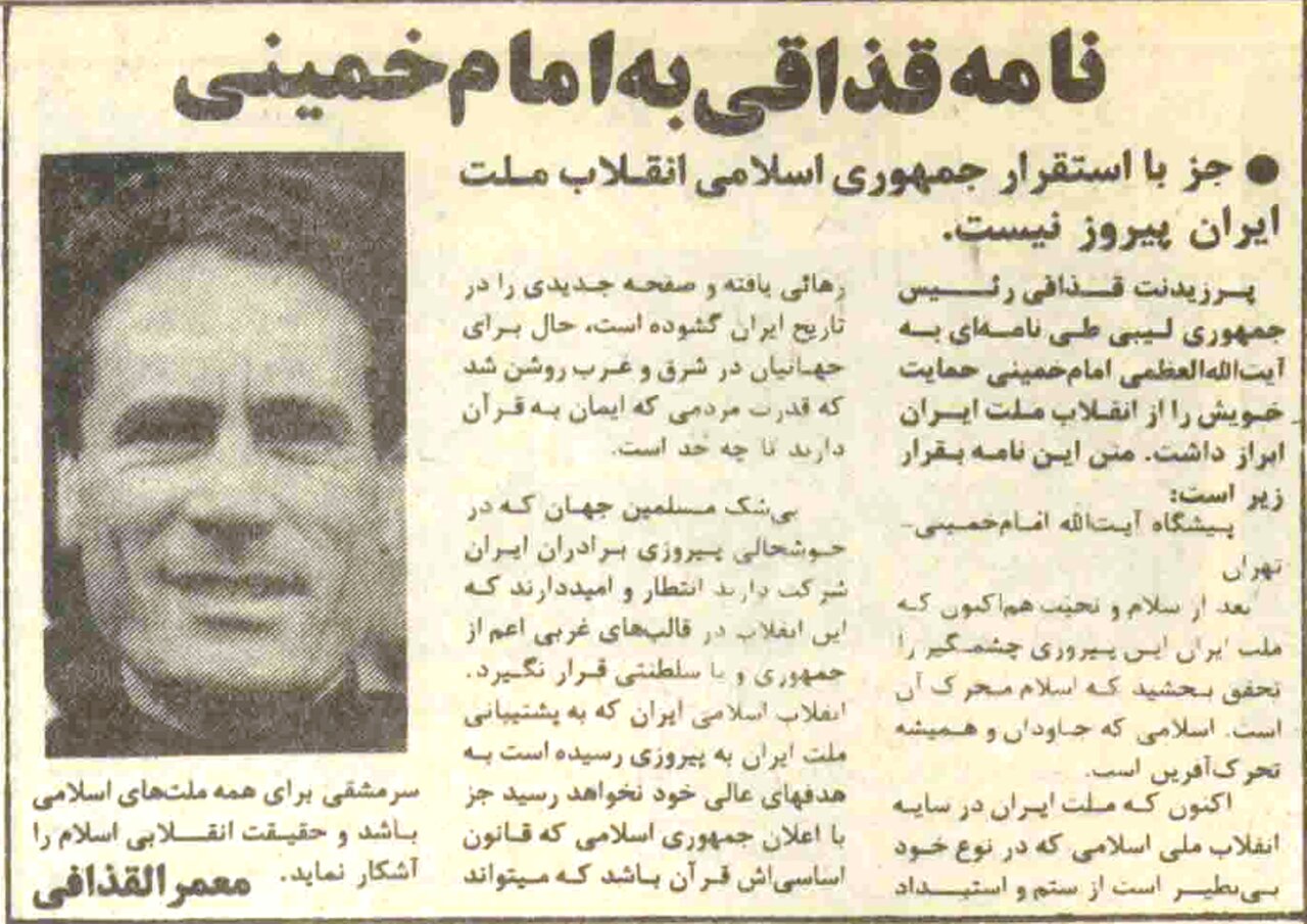 به گزارش خبرگزاری خبرآنلاین، در آستانهی پیروزی انقلاب ۵۷، معمر قذافی رئیسجمهور وقت لیبی طی نامهای به آیتالله العظمی امام خمینی حمایت خود را از انقلاب ملت ایران ابراز داشت. متن این نامه که روز پنجشنبه ۱۹ بهمن ۵۷ در صفحهی ۵ روزنامهی کیهان منتشر شد به این شرح بود:
