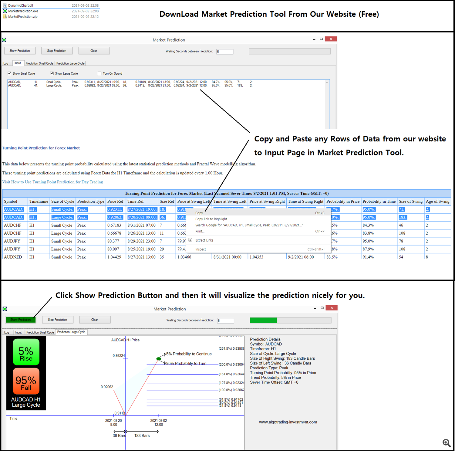 نحوه استفاده از این ابزار پیش بینی بازار ساده است. هنگامی که فایل MarketPrediction.zip را دانلود کردید، سپس آنها را در هر نقطه از هارد دیسک خود استخراج کنید. سپس فایل Market Prediction.exe را اجرا کنید. پس از آن، یک رابط کاربری ساده پیدا خواهید کرد. ردیف های داده را از صفحه وب پیش بینی بازار از پیوند کپی و جایگذاری کنید. در صورت تمایل می توانید چندین ردیف را کپی کنید. در مرحله بعد، روی دکمه “نمایش پیش بینی” کلیک کنید. نرم افزار بازار پیش بینی به طور خودکار احتمال نقطه عطف و احتمال روند را در قالب دوستانه تجسم می کند.