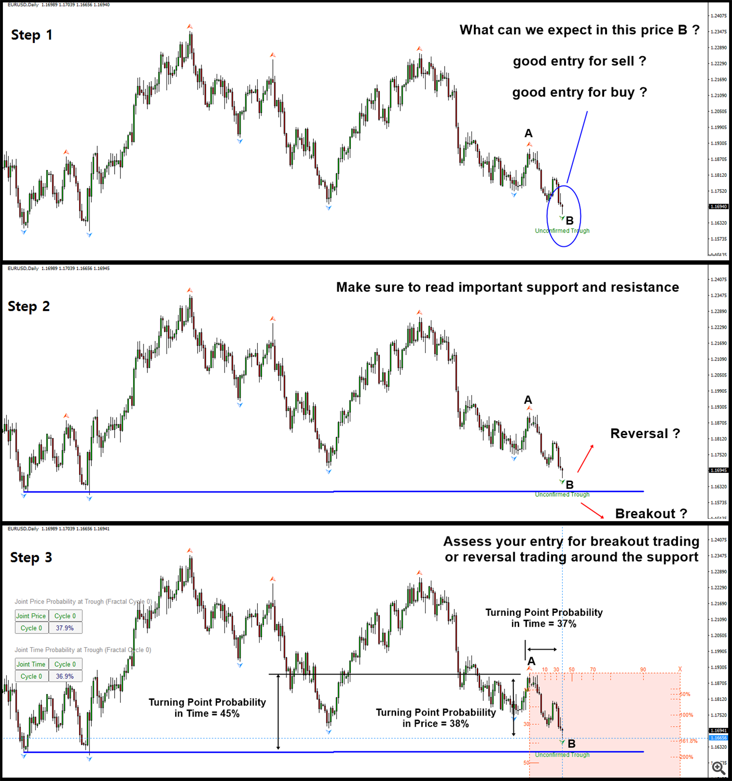 مرحله 3: در اینجا مهمترین بخش است. همانطور که در مثال ما، قیمت به سمت خط حمایت افقی حرکت می‌کند، باید ارزیابی کنیم که معامله برگشت یا شکست در اطراف این خط حمایت افقی چقدر خطرناک است. اکنون نمودار احتمال نقطه عطف خود را برای ارزیابی فرصت خود برای برگشت یا شکست اعمال می کنیم. احتمال نقطه عطف بین نقطه A و نقطه B اندازه گیری می شود. این یک نوسان قیمت یا موج فراکتال است. حالا اجازه دهید نگاهی به شماره بیندازیم.