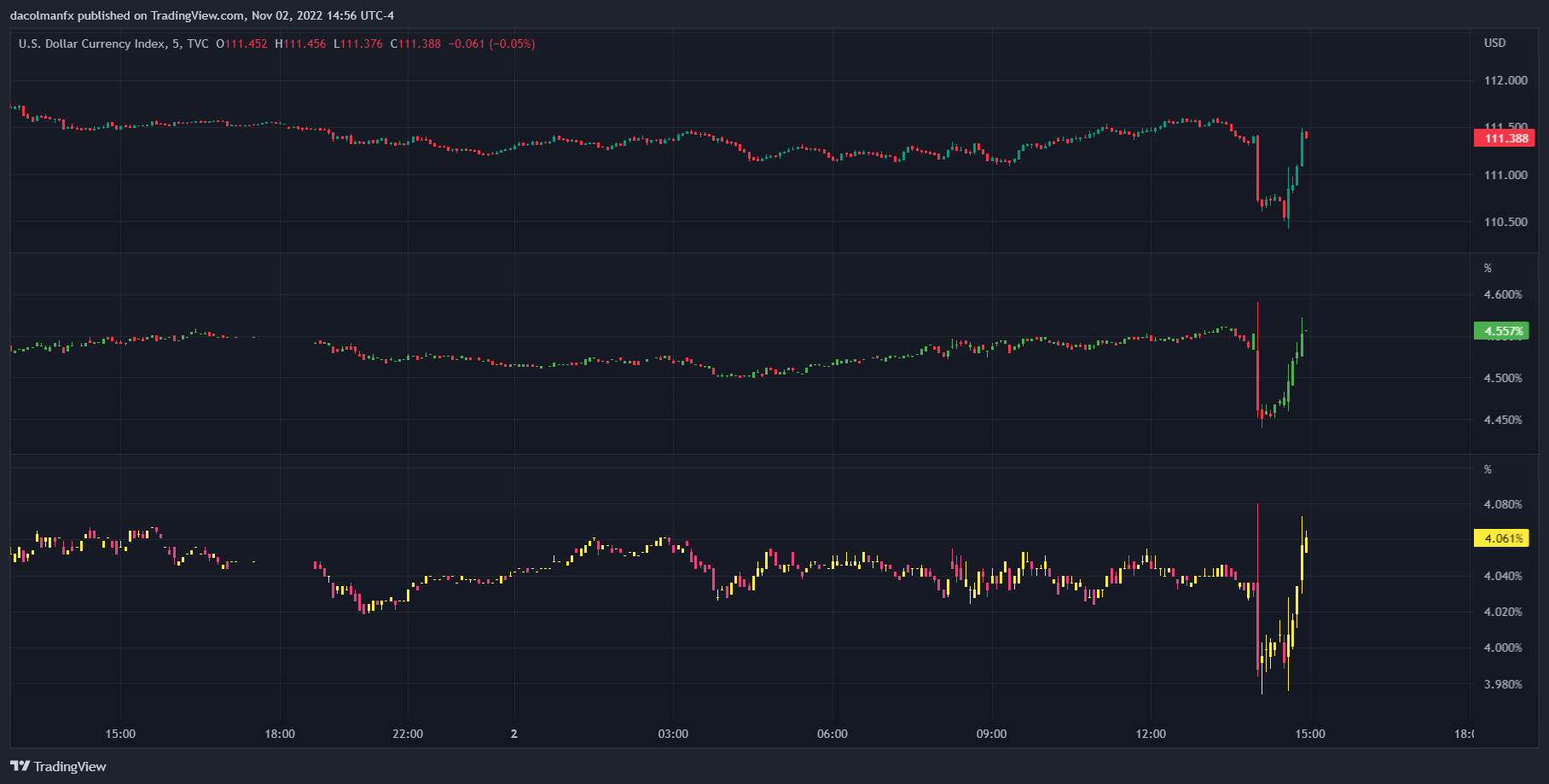 بلافاصله پس از عبور از اعلامیه FOMC، دلار آمریکا به شدت پایینتر رفت و DXY نزدیک به 1% کاهش یافت که با کاهش شدید بازدهی خزانهداری کاهش یافت. با این حال، این واکنش منفی تا حدودی در کنفرانس مطبوعاتی پاول، پس از اینکه رئیسجمهور اعلام کرد که بانک مرکزی هنوز «راههایی برای انقباض» دارد و اینکه مقصد نهایی نرخهای بهره ممکن است بالاتر از حد انتظار باشد، معکوس شد.