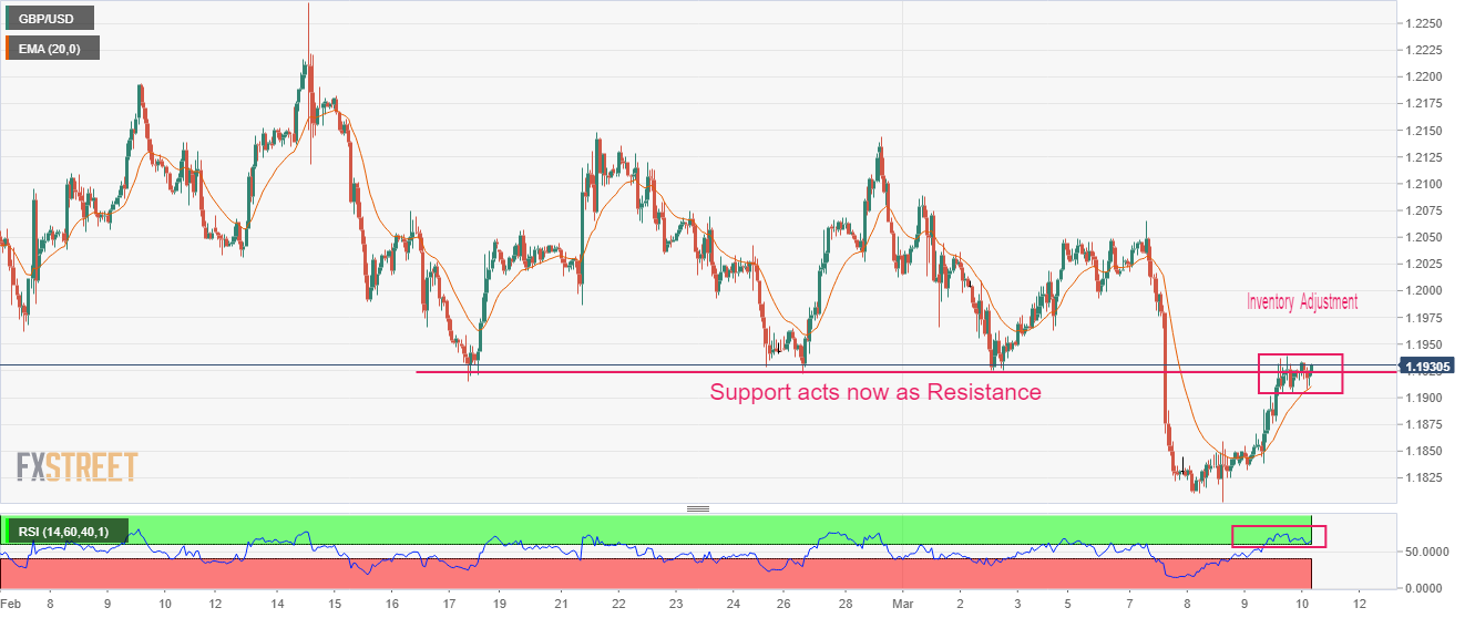 روند بهبودی در جفت GBP/USD با مقاومت افقی ترسیم شده از پایین ترین سطح 17 فوریه در 1.1915 در مقیاس ساعتی مواجه شده است. کابل در حال نمایش یک مرحله تعدیل موجودی است که می تواند انتقال موجودی از سرمایه گذاران نهادی به شرکت کنندگان خرده فروشی باشد.