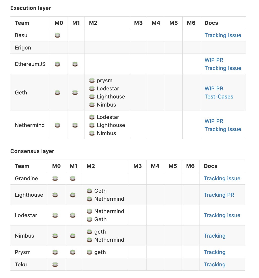 تیمهای مشتری در حال حاضر در حال کار بر روی نقاط عطف هستند – ایجاد ویژگیها، اجرای آزمایشها و انجام آزمایشهای اولیه تعامل با سایر مشتریان. علاوه بر این، یک Merge devnet هر هفته در این ماه راه اندازی می شود – merge-devnet-0 جدیدترین است.