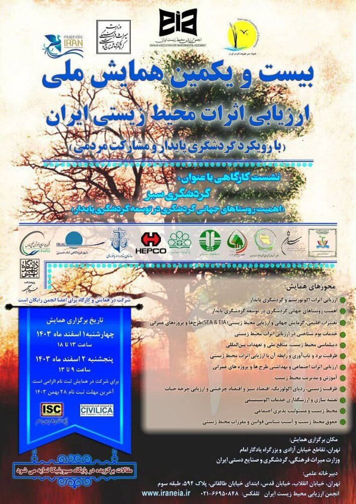 همایش ملی ارزیابی اثرات محیط زیستی ایران در روزهای چهارشنبه، یک اسفندماه از ساعت ۱۳ تا ۱۸ و پنجشنه دوم اسفندماه ساعت ۹ تا ۱۳ برگزار میشود برای شرکت در این همایش لازم است تا ۲۸ بهمنماه ثبتنام شود. محل برگزاری این همایش وزارت میراث فرهنگی، گردشگری و صنایع دستی است.