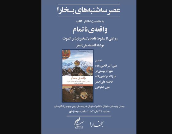 به گزارش ایسنا، «عصر سه‌شنبه‌های بخارا» که به همت علی دهباشی برگزار می‌شود به نقد و بررسی کتاب «واقعه ناتمام» نوشته فاطمه علی‌اصغر اختصاص یافته است که روز سه‌شنبه ۲۹ آبان ۱۴۰۳ از ساعت ۱۷ در باغ موزه نگارستان به نشانی میدان بهارستان، خیابان دانشسرا، خیابان شریعتمدار رفیع برپا خواهد شد.