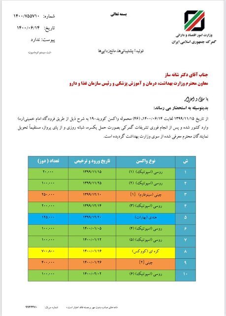 ***در جدول زیر که از سوی گمرک ایران منتشر شده است، می توانید آمار دقیق واردات واکسن را تا به امروز مشاهده کنید: