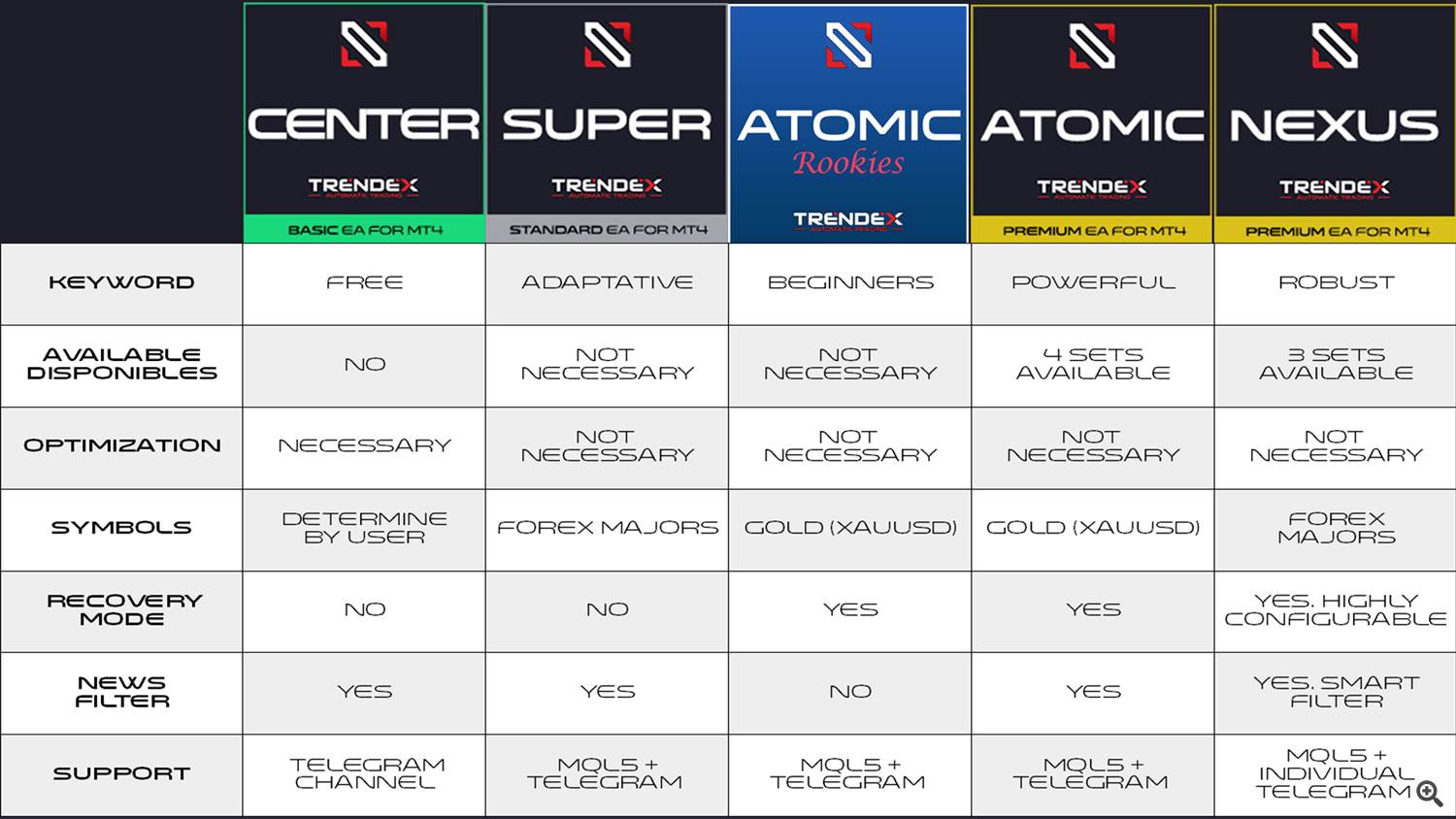 ⚫️ Nexus EA– جواهر در تاج است. این دارد 16 شرایط ورود به بازار قابل انتخاب چند زمانی کار می کند. 4 استراتژی مختلف مدیریت لات ها. 11 استراتژی شبکه مختلف. 6 حالت بازیابی پیشرفته 9 نوع مختلف Take Profit. گزینه های سفارشی برای بهینه سازی پیشرفته: شارپ، سورتینو، ضریب بازیابی، درصد زمان بازیابی. قوی و محافظه کار است.