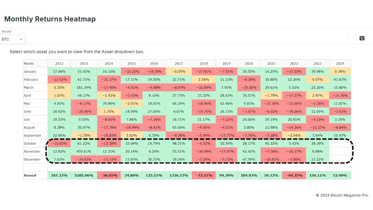 [ad_1] با نزدیک شدن به پایان سال 2024، سرمایه گذاران بیت کوین مشتاقانه به سه ماهه پایانی سال چشم دوخته اند، که به طور سنتی به اقدامات مثبت قیمتی معروف است. با گمانه زنی های بسیاری مبنی بر اینکه ممکن است یک رالی صعودی در افق باشد، بیایید داده های تاریخی را تجزیه و تحلیل
