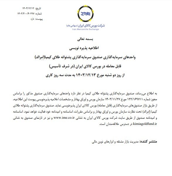 صندوق سرمایه گذاری پشتوانه طلای کیمیا در نظر دارد واحدهای سرمایه گذاری خود را براساس مجوز سازمان بورس و اوراق بهادار و مشخصات اعلامیه پذیره نویسی این اطلاعیه، از طریق بازار صندوق های سرمایه گذاری (قابل معامله) بورس کالای ایران پذیره نویسی کند.