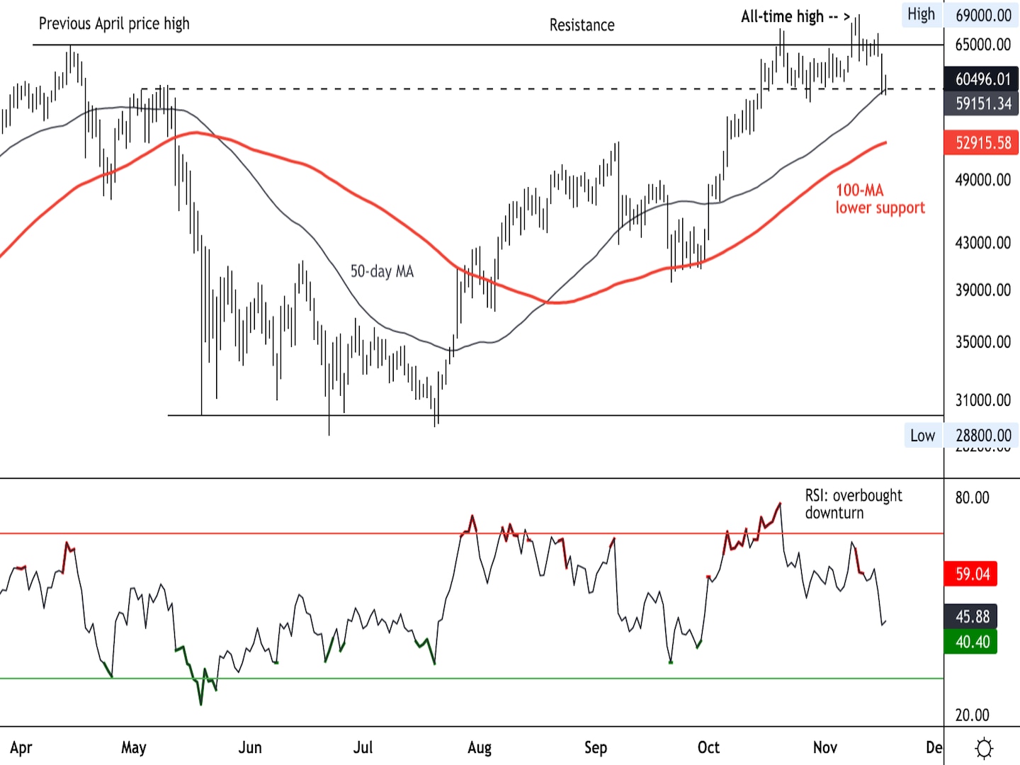 بیت کوین (BTC) پس از کاهش حدود 15 درصدی از بالاترین سطح تاریخ نزدیک به 69000 دلار، در اطراف سطح حمایت 60000 دلار تثبیت می شود.
