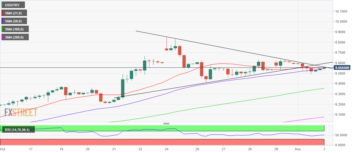از دیدگاه فنی کوتاهمدت، USD/TRY پس از تایید شکست مثلث متقارن در نمودار چهار ساعته در ساعات اولیه اروپا در روز دوشنبه، تلاش میکند تا بالاتر از سطح 9.50 را بازیابی کند.
