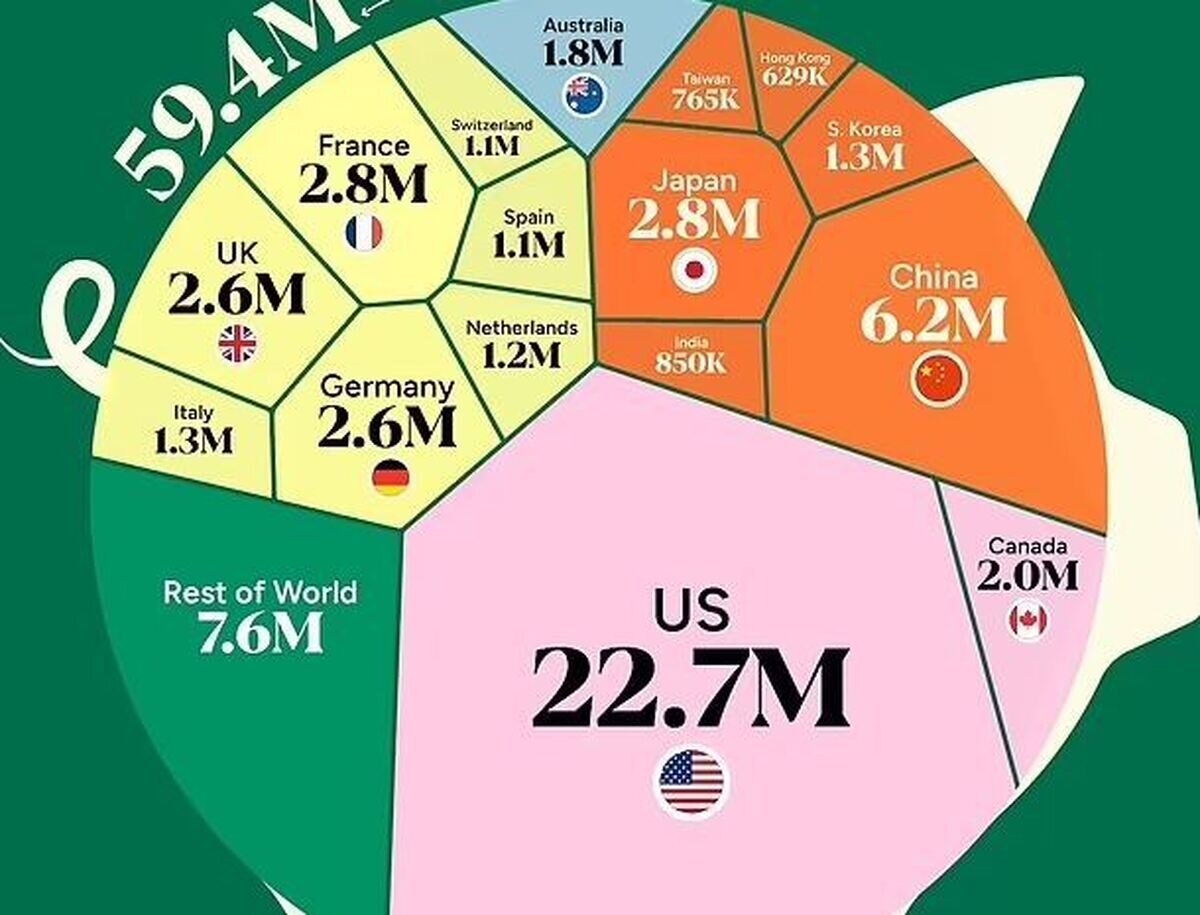 آمریکا با سهم ۴۰ درصدی جمعیت میلیونرهای جهان پیشتاز است و چین و فرانسه پس از آن در رتبه بعدی قرار دارند. ایالات متحده دارای ۲۲.۷ میلیون میلیونر است. اکثر این میلیونرها در ارزش دارایی های شان در محدود ثروت ۱ تا ۵ میلیون دلار قرار دارند که ۸۷ درصد فهرست ثروتمندان جهان را تشکیل می دهند. ایالات متحده با سهم خیره کننده ۴۰ درصدی از ثروتمندان بزرگ جهان در میان جمعیت میلیونرهای جهان پیشتاز است. طبق گزارش Visual Capitalist با استفاده از داده های UBS و Credit Suisse ایالات متحده دارای ۲۲.۷ میلیون میلیونر است که از چین با ۶.۲ میلیون و فرانسه با ۲.۸ میلیون نفر پیشی گرفته است. ایالات متحده تقریبا ۴ درصد از جمعیت جهان را در خود جای داده اما دارای ۲۲.۷ میلیون میلیونر است که از مجموع هشت کشور برتر بعدی پیشی گرفته است. افراد فوق ثروتمند که بیش از ۱۰ میلیون دلار دارند درصدی کم تری یعنی ۴.۶ درصد ثروتمندان را شامل می شوند.
