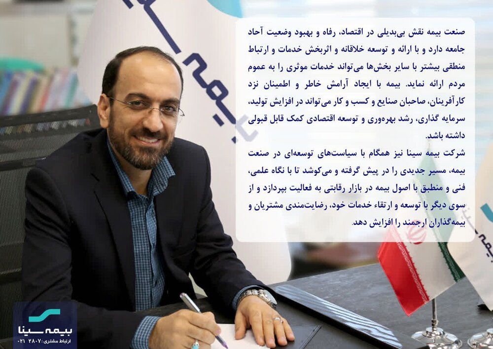 در این فرصت، فرا رسیدن 13 آذرماه و روز بیمه را حضور تمامی دست اندرکاران این صنعت شریف و خصوصاً همکاران سخت کوش و وفادارم در بیمه سینا تبریک و تهنیت عرض میکنم و امیدوارم با توکل به باری تعالی، همدلی و تلاش مضاعف، آرامش خاطر بیشتری را به هموطنان گرامی هدیه دهیم.