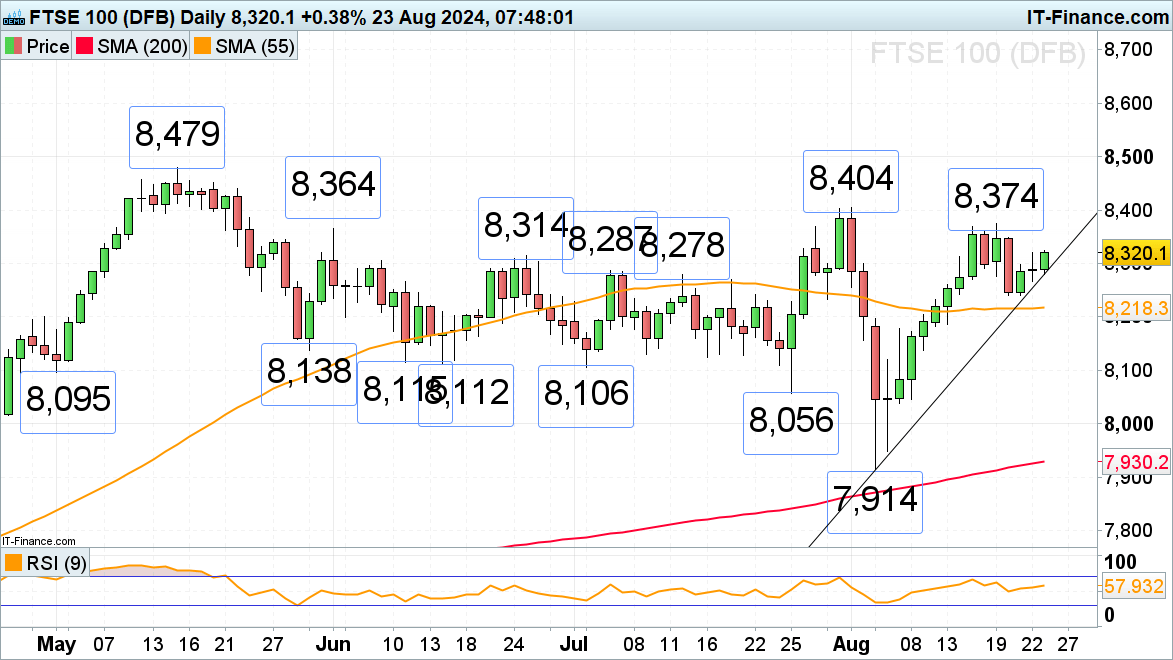 FTSE 100 در این هفته پس از تقریباً دو هفته جنون خرید، مقداری سود را تجربه کرد. پیش از سخنرانی جروم پاول، رئیس فدرال رزرو در ساعت 3 بعدازظهر و فرماندار BoE، اندرو بیلی در ساعت 4 بعد از ظهر در سمپوزیوم جکسون هول، که ممکن است شفافیتی در مورد سیاست پولی بانک مرکزی ارائه دهد. با توجه به محتوای این سخنرانی ها، این شاخص ممکن است میانگین متحرک ساده 55 روزه را در 8218 مجدداً بررسی کند یا بالاترین قیمت روز دوشنبه را در 8374 مجدداً آزمایش کند. این بخشی از مقاومت کلیدی است که تا اوایل ماه اوت در 8404 افزایش می یابد.