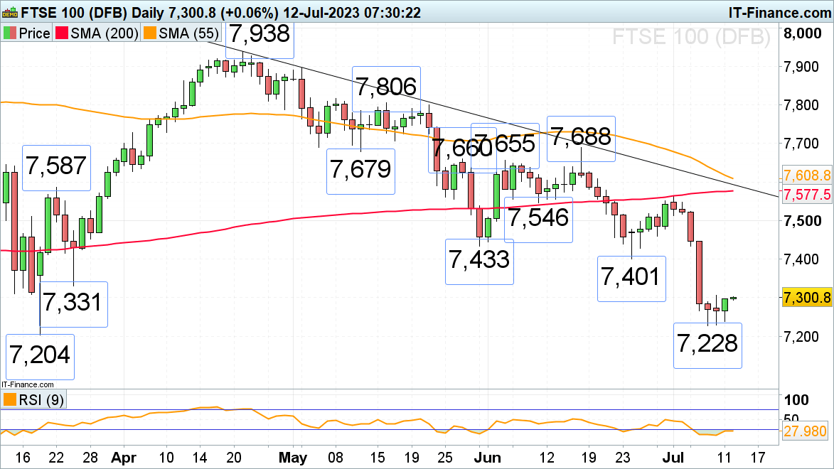 FTSE 100 در آستانه تورم کلیدی قیمت مصرف کننده در ایالات متحده (CPI) که انتظار می رود در ماه ژوئن به 3.1 درصد برسد، پس از افزایش 4 درصدی سال به سال در ماه می، توانست بالاتر از پایین ترین سطح ماه مارس خود در 7204 ثابت بماند. افزایش بالاتر از بالاترین قیمت روز دوشنبه در 7306، پایین ترین سطح 7331 اواخر مارس را روی نقشه قرار می دهد. مقاومت بسیار مهم تری را می توان بین پایین ترین سطح ماه مه و اوایل ژوئن در 7,401 تا 7,433 مشاهده کرد. در حالی که این ناحیه درپوش است، فشار کلی نزولی باید دست بالا را حفظ کند.