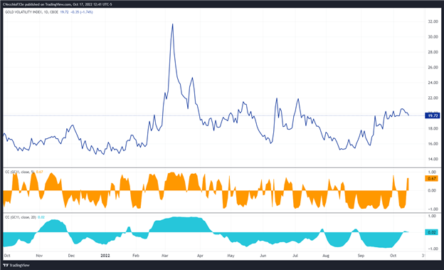 نوسانات طلا (همانطور که توسط نوسانات طلای Cboe اندازه گیری می شود ETF، GVZ، که نوسانات ضمنی یک ماهه طلا را بر اساس زنجیره اختیار معامله GLD دنبال می کند) در زمان نگارش این گزارش در 16.46 معامله می شد. همبستگی 5 روزه بین GVZ و قیمت طلا 0.67+ و همبستگی 20 روزه 0.02+ است. یک هفته پیش، در 10 اکتبر، همبستگی 5 روزه 0.96- و همبستگی 20 روزه 0.22- بود.