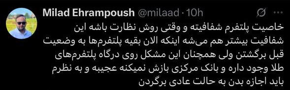گروهی دیگر از کاربران نیز تصمیم اخیر بانک مرکزی را بازگشت به اقتصاد دستوری میدانند که در دولت منتقدان بزرگی دارد اما به نظر میرسد، لااقل در بانک مرکزی توجهی به این ایده نمیشود و همچنان این تصور وجود دارد که میتوان با دستورات ناگهانی و بدون پشتوانه اقتصاد کشور را اداره کرد. تصوری که اشتباه بودن آن در سالهای گذشته بارها اثبات شده و این بار گریبان پلتفرمهای خرید و فروش طلا را گرفته است.