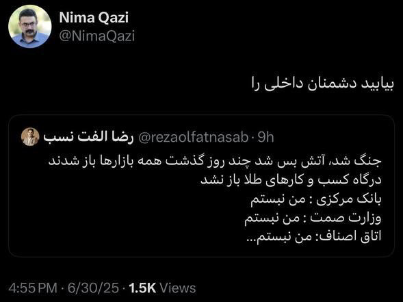 نیما قاضی، رییس انجمن تجارت الکترونیک نیز معتقد است در کنار دشمن خارجی، باید به دشمنان داخلی نیز توجه کرد.