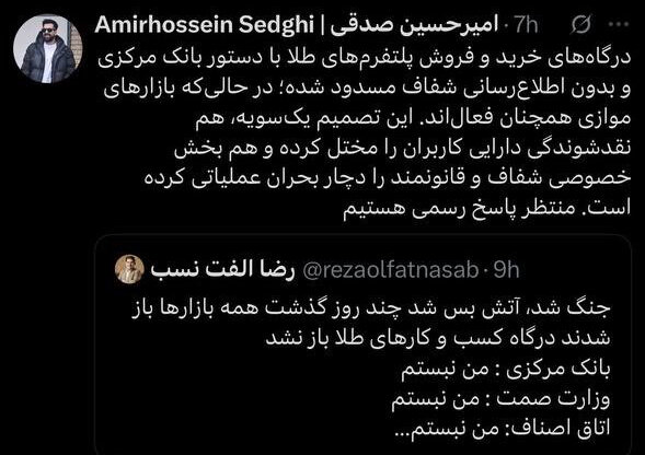 ارزیابی موضوعات مطرح شده در فضای مجازی نشان میدهد که گروهی از کاربران و شهروندان این سوال را مطرح میکنند که چرا وقتی با عبور از روزهای جنگ، تمامی بازارها کار خود را رسما از سر گرفتهاند و خرید و فروش در بازارهای مختلف ادامه دارد، همچنان درگاه پلتفرمهای فروش طلا مسدود مانده است؟