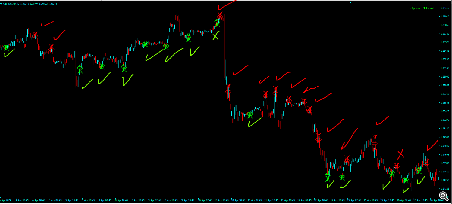 خوب حالا 15 دقیقه GBPUSD را باز می کنیم و این بار سیگنال ها را دنبال می کنیم و معاملات خود را باز می کنیم که فلش ها سبز و قرمز ظاهر شد اگر سبز شد خرید می کنیم و اگر قرمز است می فروشیم و اجازه می دهیم تعداد برد و چند باخت را بشماریم.
