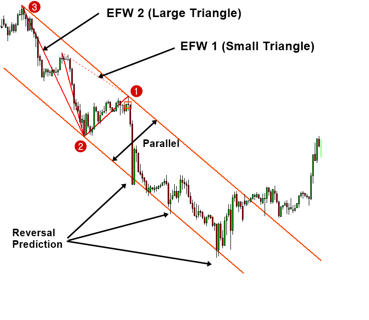 در فصل قبل کانال موج فراکتال را معرفی کردیم. احتمالاً از نظر نحوه ساخت کانال های موج فراکتال سخت نبود. اکنون می توان همین ایده را با استفاده از الگوهای روی هم اضافه کرد. ساخت کانال Superimposed را می توان مانند قبل در دو مرحله انجام داد. اولاً با اتصال نقطه 1 و نقطه 3 خط پایه را رسم می کنیم. ثانیاً با بیرون کشیدن خط پایه به موازات نقطه 2 می توانیم کانال را روی الگوی روی هم قرار دهیم. معمولاً ایده خوبی است که کانال را روی 3 نقطه موج فراکتال تعادل بزرگتر بکشید. کانال روی الگوی روی هم در مقایسه با کانال ایجاد شده از تک EFW قدرت پیشبینی قویتری دارد. اگر با این ایده قانع نیستید، تصور کنید که دو موج ساده تداخل دارند. دو موج می توانند با هم تعامل سازنده یا مخرب داشته باشند. برای داشتن تداخل سازنده، دو موج باید اوج یا فرورفتگی را در یک موقعیت با هم همپوشانی داشته باشند. هنگامی که نقاط پایانی دو موج فراکتال تعادلی در یک موقعیت قرار می گیرند، دو موج فراکتال تعادلی رابطه سازنده ای خواهند داشت. به عنوان مثال، معاملهگرانی که EFW 1 را به عنوان فرصت معاملاتی شناسایی کردهاند، به همراه معاملهگرانی که EFW 2 را به عنوان فرصت معاملاتی شناسایی کردهاند، به نیرو میپیوندند. از این رو، الگوهای روی هم قرار داده شده با دو یا سه EFW واکنش بسیار قوی تری را به بازار خواهد آورد. به طور کلی، EFW های بیشتری روی هم قرار می گیرند، قدرت پیش بینی آن نیز افزایش می یابد. بنابراین، الگوهای روی هم به طور طبیعی بهترین مکان برای قرار دادن کانال شما هستند.