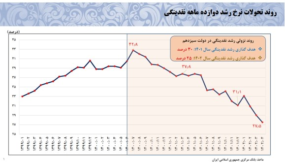 با آغاز به کار دولت سیزدهم مسئله کنترل رشد نقدینگی و تورم به عنوان یکی از مهمترین اولویتهای اقتصادی دولت و بانک مرکزی مورد توجه قرار گرفت. در این راستا، بررسی نرخ رشد دوازدهماهه نقدینگی نشان میدهد که رشد نقدینگی طی یک روند نزولی از 40.6 درصد در پایان سال 1399 و39.0 درصد در پایان سال 1400 به 31.1 درصد در پایان سال 1401 کاهش یافته و با تداوم این روند نزولی رشد نقدینگی به 27.5 درصد در پایان چهار ماهه اول سال 1402 رسید که این امر بیانگر توفیق بانک مرکزی در کنترل رشد ترازنامه بانک ها و دستیابی به اهداف کنترل مقداری کلهای پولی و مدیریت رشد نقدینگی در محدوده هدف تعیین شده برای سال 1401 (30 درصد) بوده است. لازم به اشاره است نرخ رشد دوازده ماهه نقدینگی در پایان مردادماه 1400 معادل 39.1 درصد بوده است.