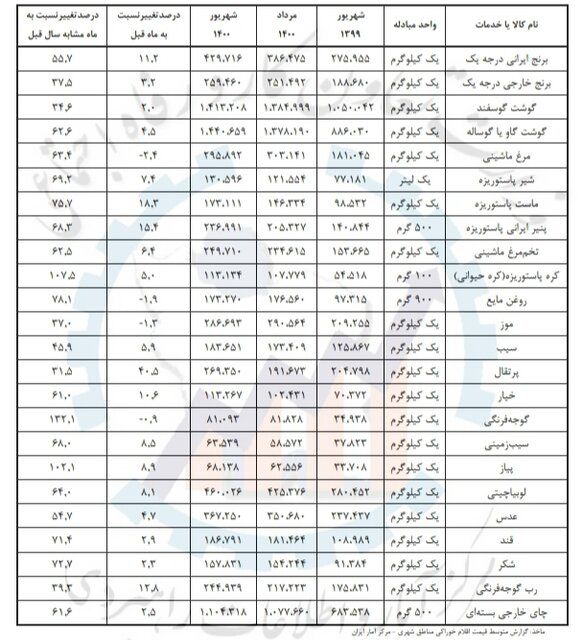 بر اساس گزارش مرکز آمار و اطلاعات راهبردی وزارت کار، قیمت برخی اقلام خوراکی طی شهریور ماه ۱۴۰۰ نسبت به ماه قبل  از آن به گونه ای بوده که بیشترین افزایش قیمتها در کالاهای منتخب مربوط به پرتقال(۴۰.۵درصد)، ماست پاستوریزه (۱۸.۳درصد) و پنیر پاستوریزه (۱۵.۴ درصد) بوده است.