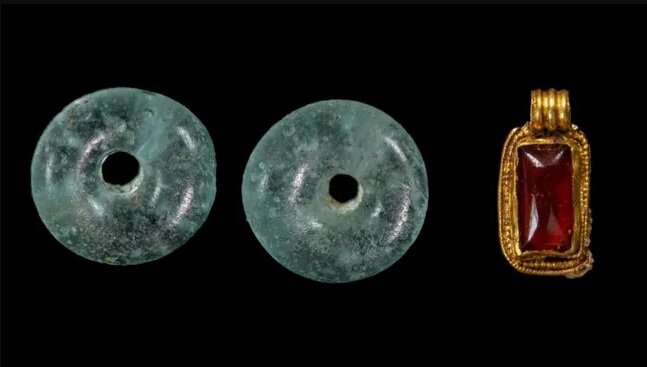 همچنین دو آویز کوچک طلا به همراه سنگهای قیمتی و یک آویز ظریف نقره تزئینشده با کهربا دور سر و استخوان سینه نوجوان قرار داشت. در این گور همچنین دو مُهره کوچک شیشهای آبی به همراه یک سنجاقسینه حلقهای کشف شد.