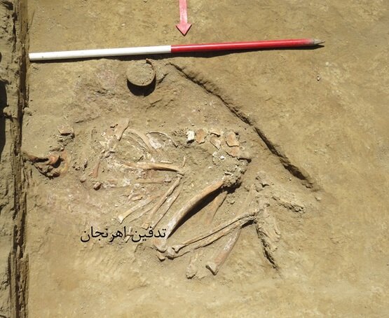 سرپرست برنامه گمانه‌زنی اهرنجان افزود: یکی از تدفین‌ها را با لایه‌ای از گِل اُخری پوشانده‌اند و آثار گل اخری در کف چاله گور و همچنین روی استخوان‌ها دیده می‌شود.