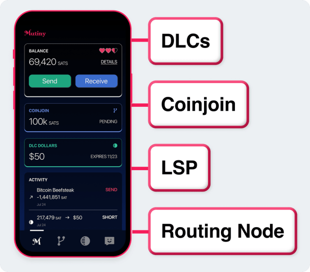 کیف پول Mutiny یک کیف پول خودسرپرست و متمرکز بر حریم خصوصی است. این می تواند در هر مکانی اجرا شود، و مقاومت در برابر سانسور پلت فرم و نصب آنی را ارائه می دهد. علاوه بر کیف پول، Mutiny در حال توسعه یک پیادهسازی گره نسل بعدی متناسب با کیف پول Mutiny است و ابزارهای حفظ حریم خصوصی روی زنجیره و لایتنینگ را ادغام میکند.