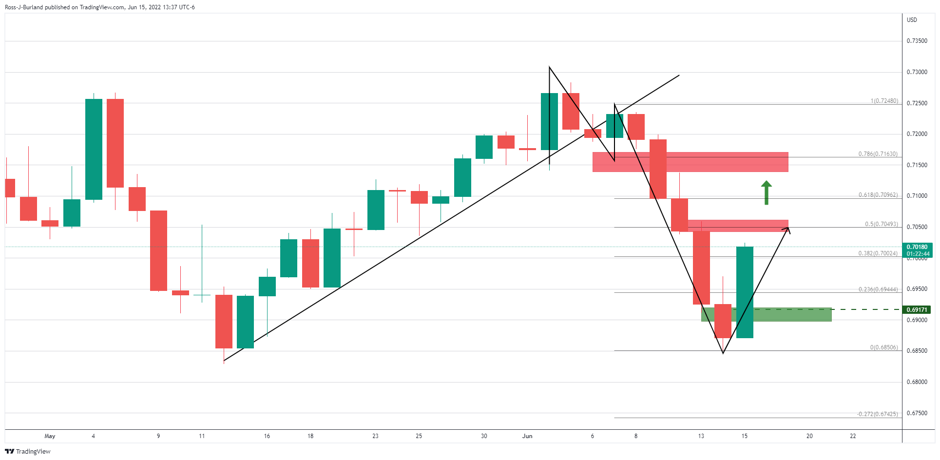 AUD/USD با توجه به افزایش ریسک و تسکین این موضوع که رئیس فدرال رزرو، جروم پاول، در حال استدلال برای انقباض کمتر تهاجمی است، در حال بهبود است. این امر فنی را به چشم‌اندازی صعودی بر اساس تحلیل زیر هدایت می‌کند: