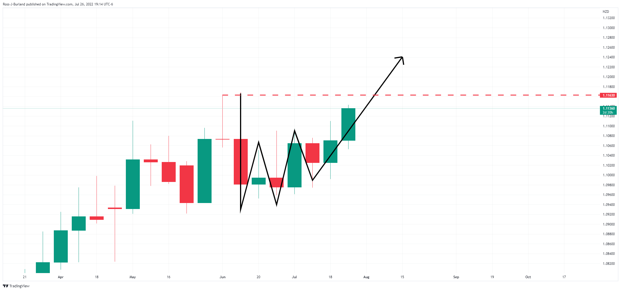 قیمت به دنبال داده ها و در نمودار روزانه کاهش یافته است و خرس ها می توانند 61.8% اصلاحی نزدیک به 1.1080 را هدف قرار دهند.