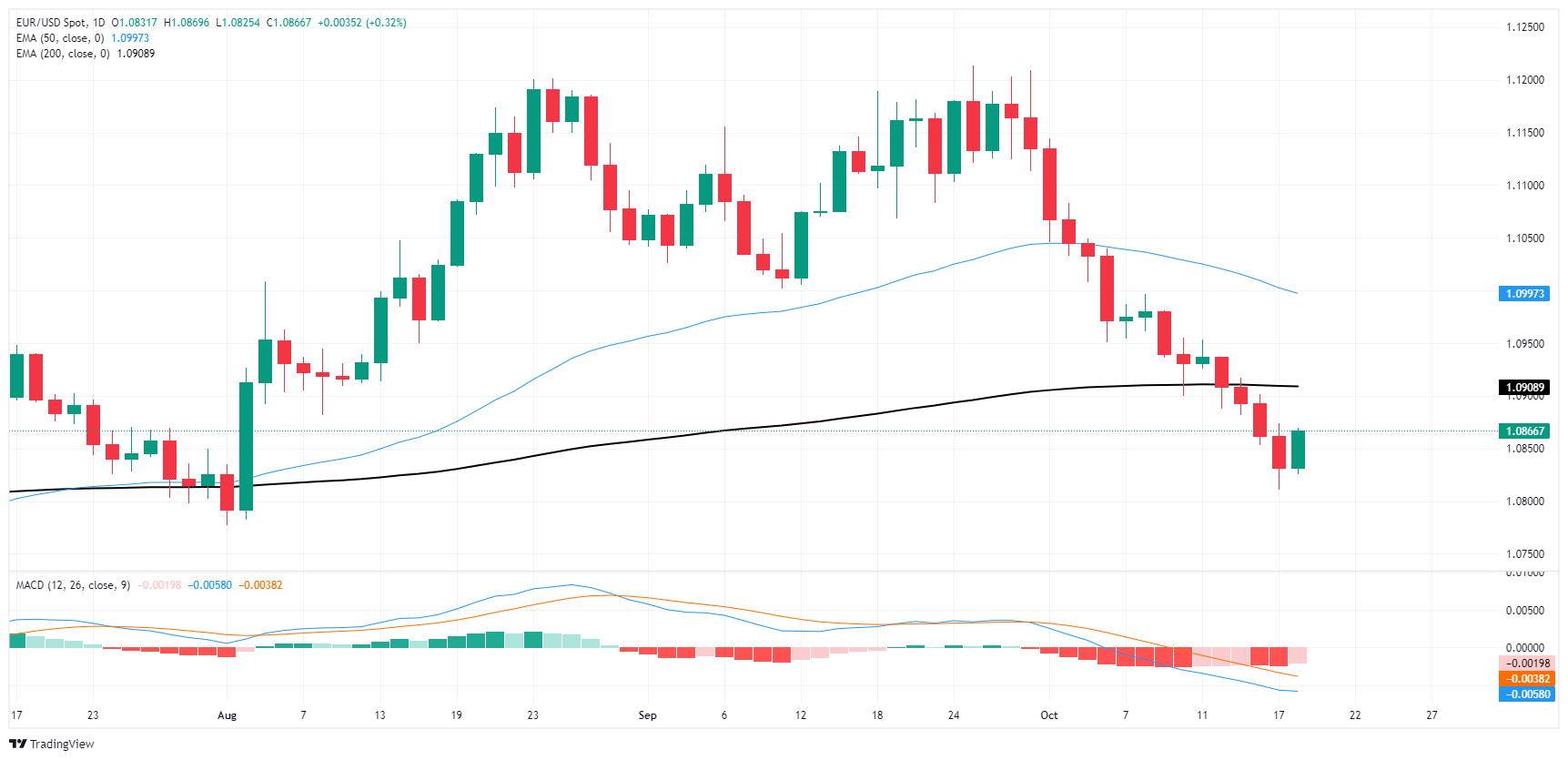 شاخص واگرایی میانگین متحرک (MACD) همچنان به فشار نزولی اشاره می کند، با هر دو خط MACD و سیگنال در قلمرو منفی. علیرغم افزایش اخیر قیمت، هیستوگرام نزولی باقی می ماند و نشان می دهد که بهبود فعلی ممکن است محدود باشد. شکستن بالاتر از میانگین متحرک نمایی 200 روزه در 1.0899 برای نشان دادن یک تغییر معنی دار در حرکت، با هدف قرار دادن سطوح مقاومت 1.0950 و 1.1000 ضروری است. با این حال، شکستن این مانع می تواند منجر به افزایش فشار فروش شود، با حمایت قابل توجه بعدی در حدود 1.0800.