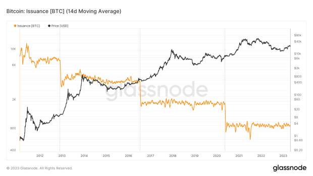 مجموع عرضه به طور خاص در کد تعریف نشده است، اما در عوض از زمانبندی صدور کد استخراج میشود که هر 210000 بلوک یا تقریباً هر چهار سال به نصف کاهش مییابد. این رویداد کاهش، نصف شدن بیت کوین (یا در برخی محافل “نصف شدن”) نامیده می شود.