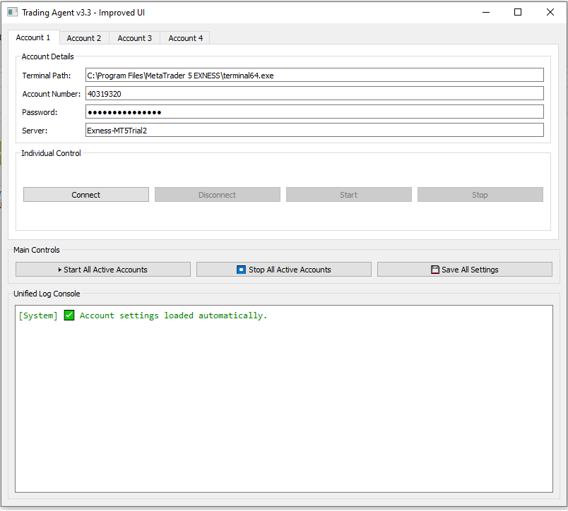 مدیریت چند حساب: اتصال و کنترل حداکثر 4 حساب MT5 مختلف از یک رابط واحد. ایده آل برای کسانی که حساب های خود را مدیریت می کنند ، حساب اعضای خانواده یا حساب های مشتری.