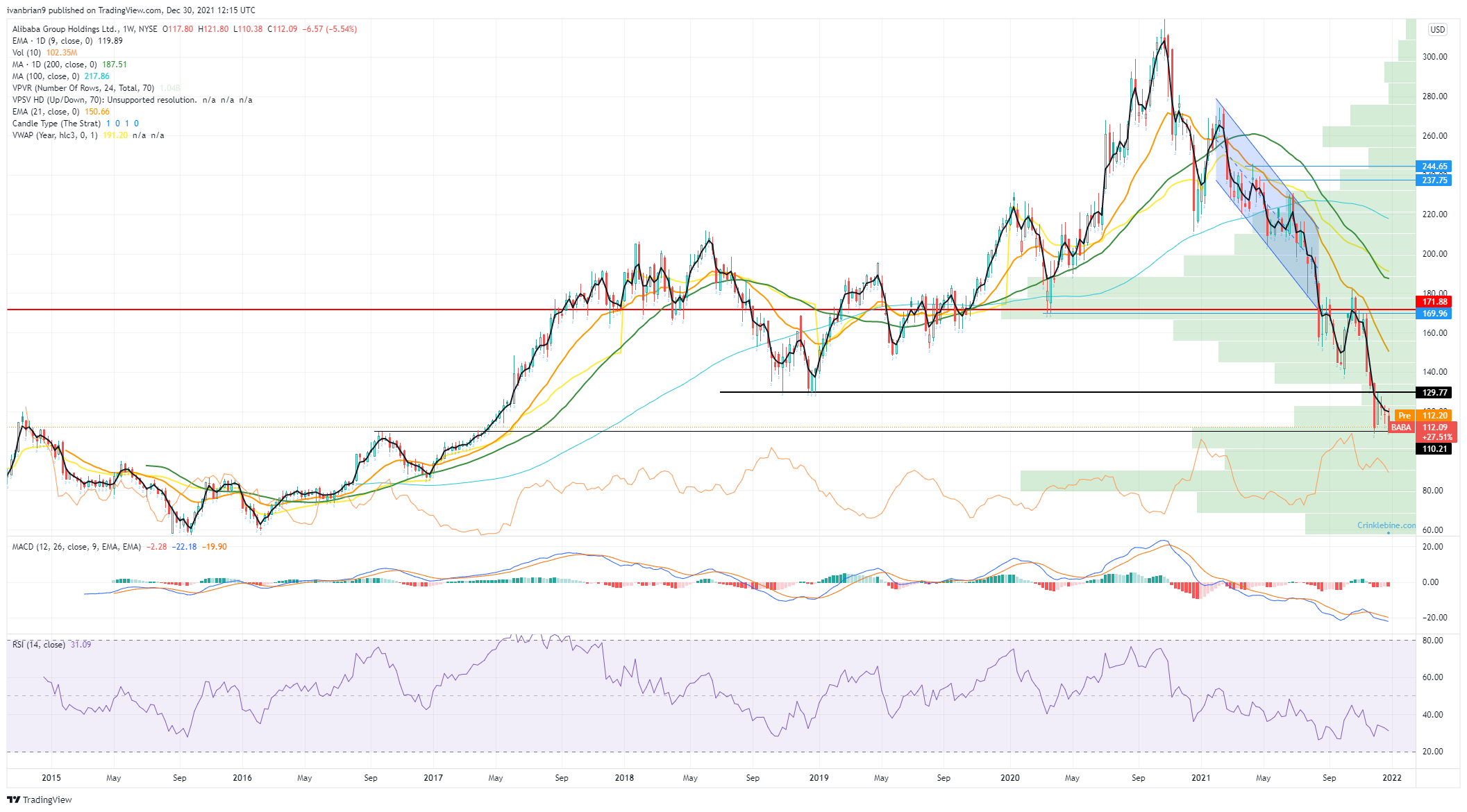 شکستن سطح 130 دلار اکنون حمایت 110 دلاری و 100 دلاری را در معرض دید قرار داده است. 110 دلار علی‌بابا را به جایی که در سال 2016 معامله می‌کرد، باز می‌گرداند. در آن زمان، BABA 23.5 میلیارد دلار درآمد داشت، اکنون علی‌بابا بیش از 100 میلیارد دلار درآمد دارد.