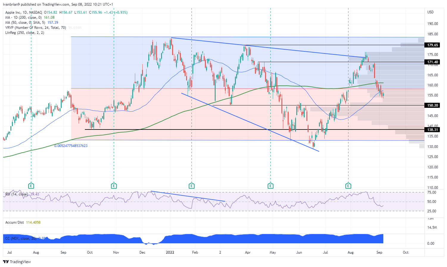 رالی عظیم تابستانی هنوز در حال رها شدن است. سهام اپل بیش از 30 درصد از پایین ترین سطح ماه ژوئن رشد کرد. سپس در خط روند بالا شکست خورد و همچنین در شاخص قدرت نسبی (RSI) بیش از حد خرید شد. از آن زمان به زیر میانگین متحرک 200 روزه و 50 روزه رفته است. منطقه پشتیبانی اصلی بعدی در حدود 150 دلار با یک منطقه با حجم بالا و همچنین برخی از پایین ترین سطح های قابل توجه قدیمی (14 مارس) و اوج (1 ژوئن) است. در زیر، 200 روزه سهام را نزولی نگه می دارد و نقطه محوری میان مدت است. افزایش اخیر ارزش دلار یک باد مخالف دیگر برای اپل است. اپل بیش از 60 درصد از درآمد خود را در خارج از ایالات متحده تولید می کند.