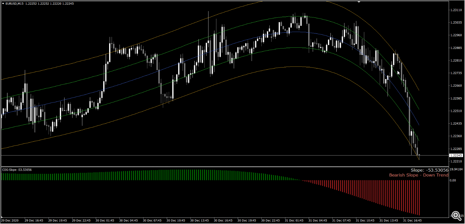 اگر شیب قرمز باشد، نشان می دهد که خطوط COG به سمت پایین شیب دارند و قیمت در روند نزولی قرار دارد.