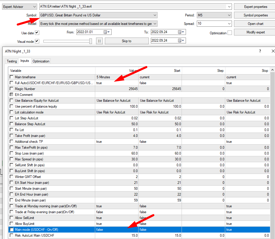 For full automatic testing mode for all currency pairs specified in the EA settings, specify (Full Auto Trade (USDCHF/EURCHF/EURUSD/GBPUSD/USDCAD + additional pairs) – true), this mode works only in MT5 tester.