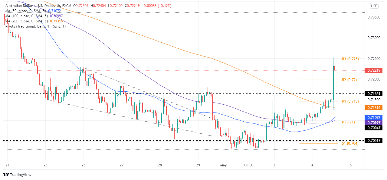 AUD/USD به شدت در حال افزایش است و از 0.7090 به 0.7230 جهش کرد پس از اینکه فدرال رزرو تصمیم گرفت تا نرخ بهره را 50 واحد در ثانیه افزایش دهد و از آغاز انقباض کمی (QT) در اول ژوئن خبر داد، زیرا بانک مرکزی ایالات متحده قصد دارد آن را کاهش دهد. ترازنامه 8.9 تریلیون دلاری آن. در حدود 0.7220s، AUD/USD احساسات سرمایه گذاران را در حین صحبت جروم پاول، رئیس فدرال رزرو منعکس می کند.