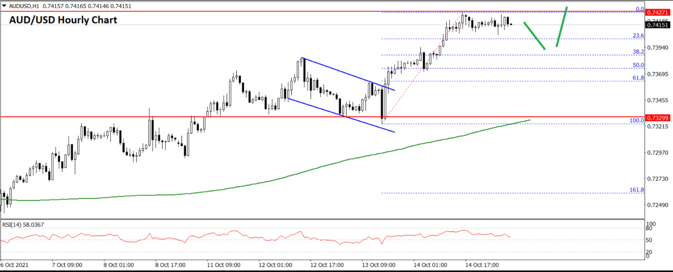 · شکستگی در بالای کانال نزولی کلیدی با مقاومت نزدیک 0.7350 در نمودار ساعتی AUD/USD وجود داشت.