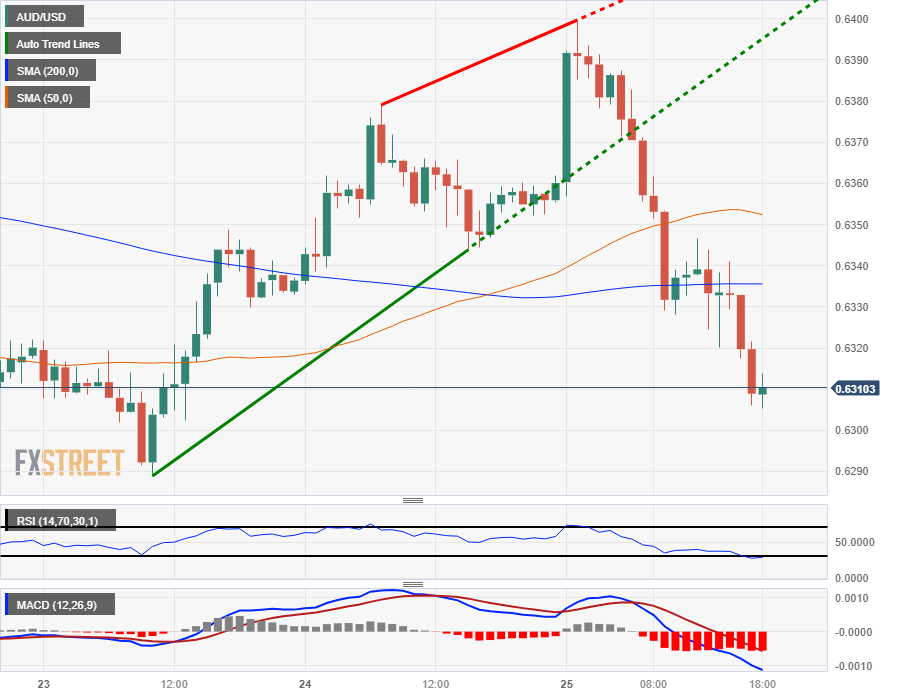 The AUD/USD hit an early high of 0.6399 on Wednesday, falling just shy of the 0.6400 handle before the Aussie (USD) went into a full reversal, sending the pair tumbling 1.4% from the day’s high bids to trade back into the 0.6300 region.