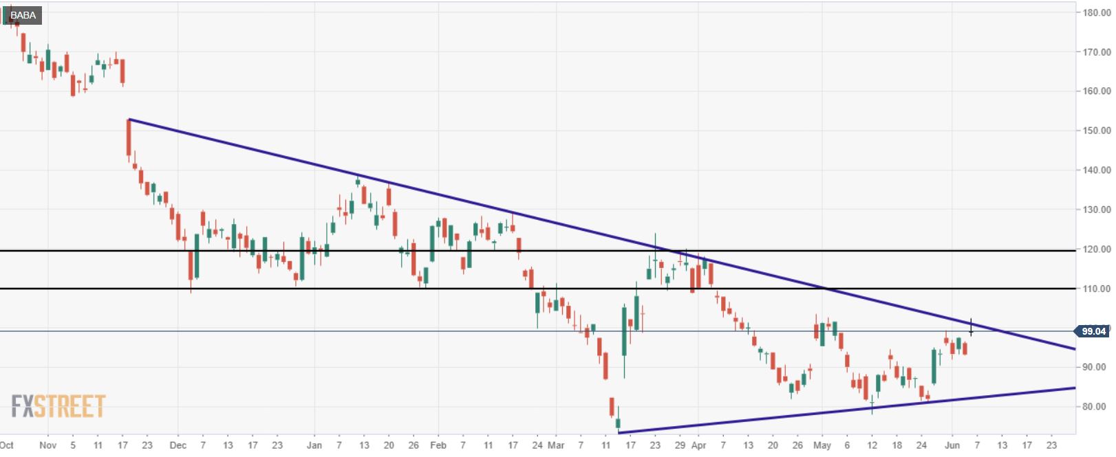 سهام علی بابا تلاش کرد تا از سد 100 دلاری عبور کند در اواخر آوریل و اوایل اردیبهشت اما پس از چهار جلسه منصرف شد. اکنون خط بالای گوه 101 دلار است. این کار برق رسانی به منطقه را حتی دشوارتر می کند. اگر سهام BABA بتواند بالاتر از اوج 103.51 دلار در 29 آوریل بسته شود، آنگاه این نشان دهنده یک صعود خرس جدید خواهد بود. همانطور که قبلاً ذکر شد، اولین هدف صعودی 110 دلار است. این سطح ابتدا به عنوان حمایت و سپس مقاومت از دسامبر 2021 تا آوریل امسال به طور مداوم عمل کرد.