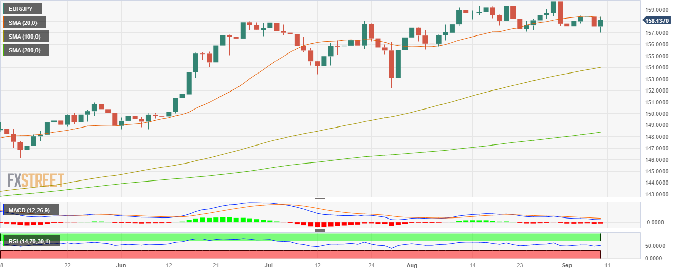 The daily charts suggest a neutral to bullish outlook for the cross, as the EUR/JPY’s bulls were constantly rejected by the 20-day Simple Moving Average (SMA) of 158.30 since Monday. In that sense, bulls are starting to lose steam as the Relative Strength Index (RSI) has a positive slope slightly above its midline, while the Moving Average Convergence (MACD) exhibits red bars.